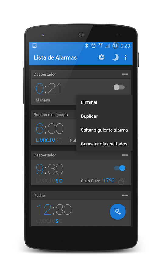 - Posibilidad de saltar cualquier día las alarmas semanales (un día festivo por ejemplo) que conseguirá que no te olvides nunca más de volver a activar la alarma.
