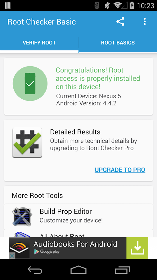 Esta aplicación ofrece incluso al último usuario de Android con un método sencillo para comprobar su dispositivo para root (administrador, superusuario o su) el acceso. La aplicación ofrece una interfaz de usuario muy simple que comunica fácilmente al usuario si tienen o no correctamente la configuración root (superusuario) de acceso.